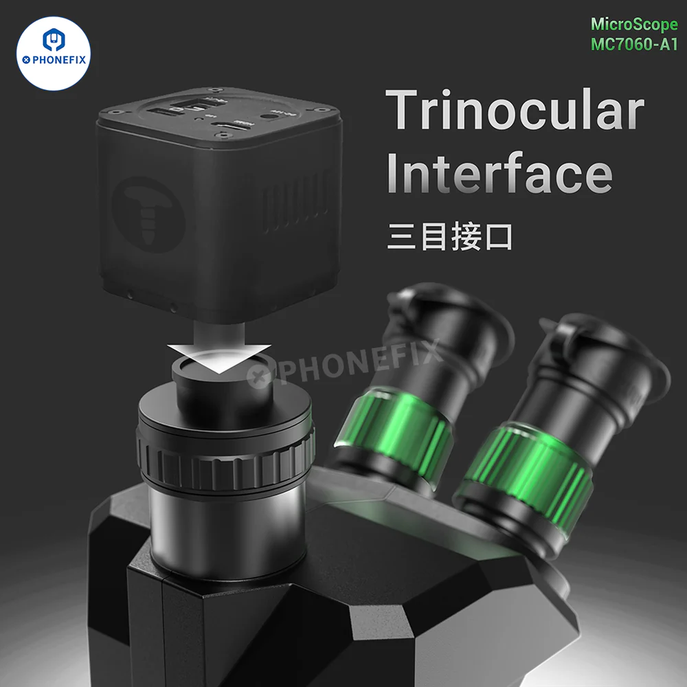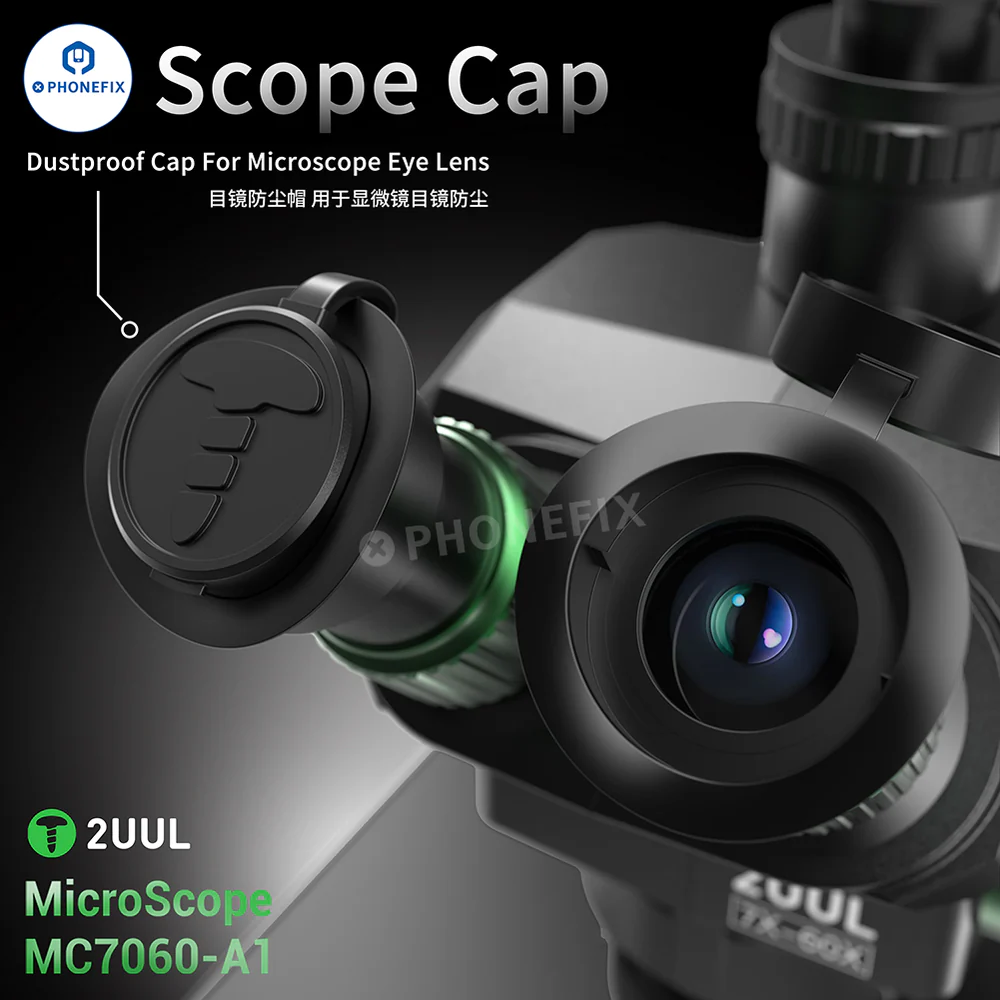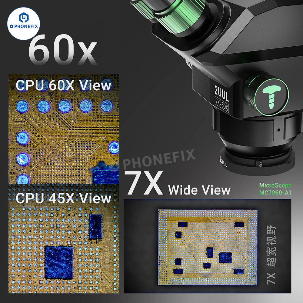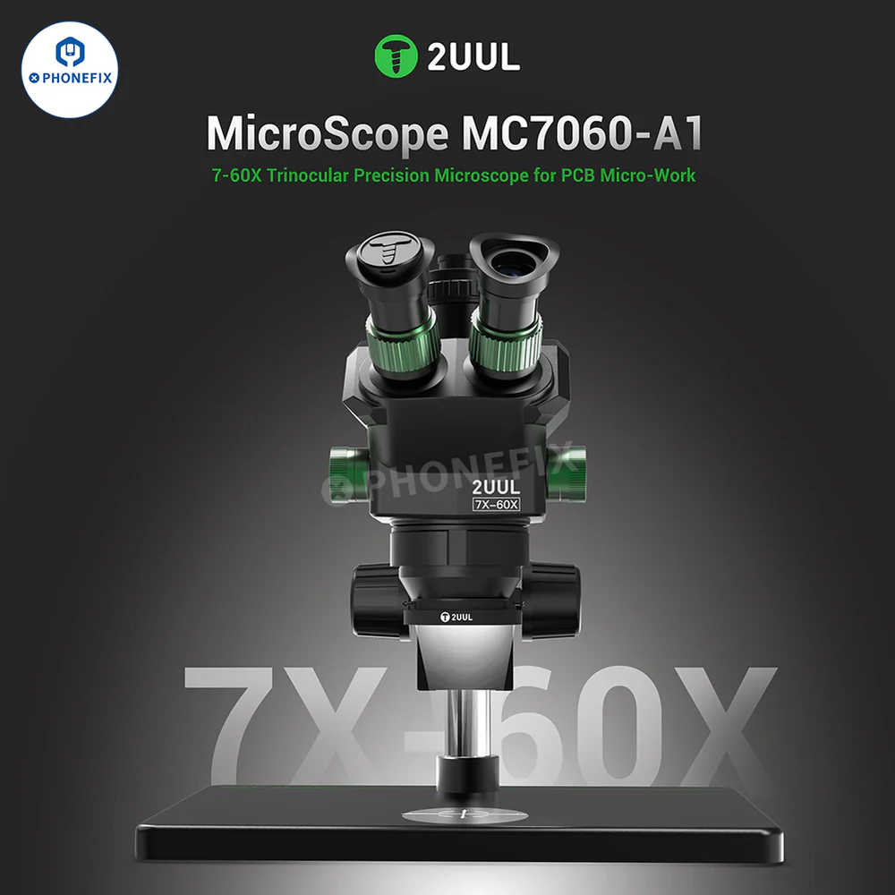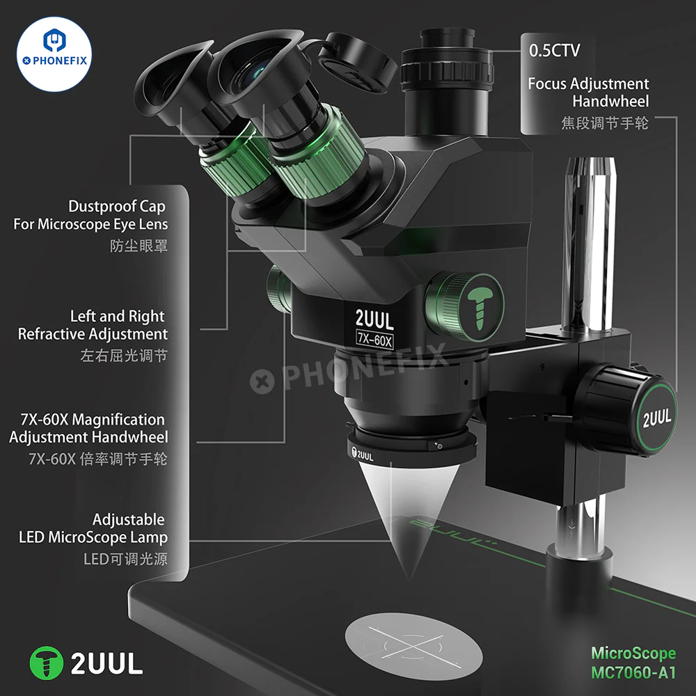 2UUL MicroScope MC7060-A1 7X-60X Synchronous Zoom Trinocular Stereo Microscope for Mobile Phone PCB Micro-soldering Work. 2UUL 7-60X Trinocular Microscope with WF10X/23mm eyepieces, 0.5X CTV lens adapter, adjustable ring lamp and last base, can be used with 4K HDMI cameras, suitable for welding and repairing CPU BGA chips on motherboards of mobile phones and other electronic products.